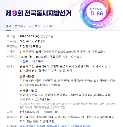 | 사전투표 | 2026년 5월 29일 ~ 5월 30일 |